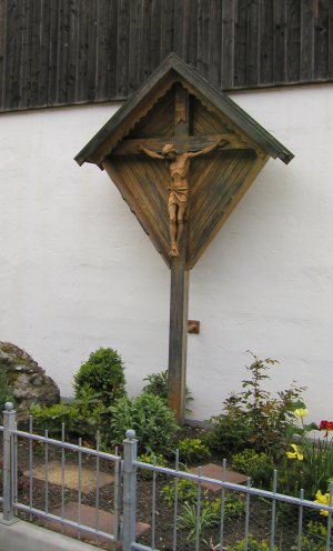 Das Kreuz an der Wand des Ziegler-Anwesen ist von einem liebevoll gepflegten Garten umgeben. |